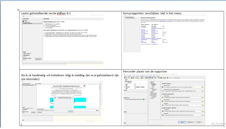 Ik heb Aldfaer versie 8.1. opnieruw geïstalleerd. Hierbij worden bljjkbaar de bonusrapporten en invoegtoepassingen automatisch ook geïnstalleerd. Als ik dan naar tonen / rapporten ga zie ik geen "overige rapporten" in het menu verschijnen en kan ik dus geen van de bonusrapporten genereren.Als ik via help/versiebeheer- invoegtoepassingen de bonusrapporten handmatig probeer te installeren krijk ik de melding dat deze reeds geïnstalleerd zijn.Wat kan de oorzaak zijn dat ik 'overige rapporten' niet te zien krijg in tonen / rapporten?Met oprechte dank voor jullie hulp !