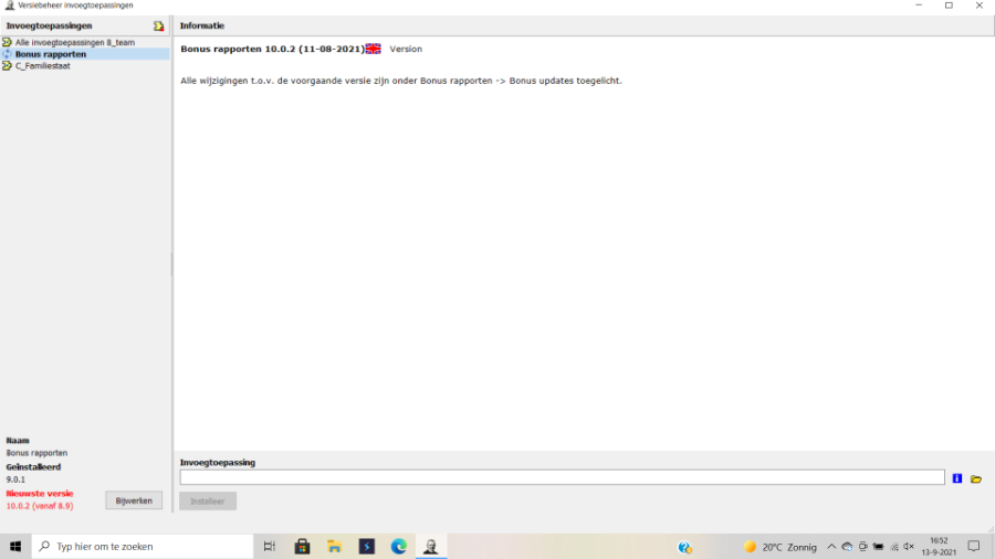 ik heb aangenomen dat Aldfaer versie 10 is geïnstalleerd. Kijk nogmaals wat je ziet onder Help -> Info . Ik heb het vermoeden dat je nog niet Aldfaer 10 hebt geïnstalleerd. Vandaar dat je onder help -> Versiebeheer Invoegtoepassingen bij de Bonusrapporten links onderin in het rood ziet staan dat de nieuwste versie 10.0.02 is.