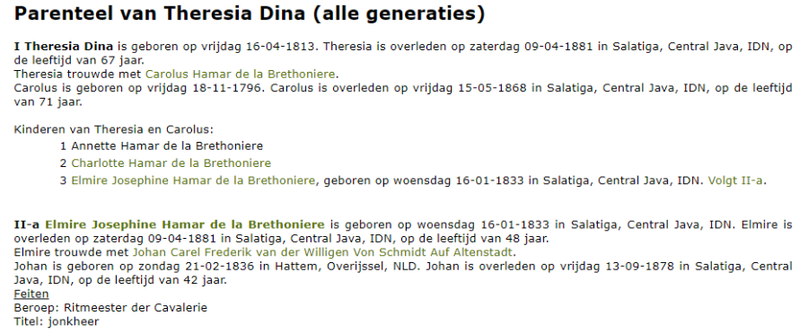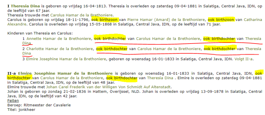 Qua tekst in de parenteel etc. is het volgende veranderd: het "ook birthdochter / birthzoon" is inderdaad weg. Weg betekent hier ook echt weg: er staat gewoon niets meer. Geen tekst meer wie de ouders zijn van Carolus in dit geval. Tekst ("zoon van A en B") en de linken naar A en B zijn nu helemaal weg. En als je een hele lange parenteel hebt, waarin steeds veel kinderen voorkomen, is dat bij kind nr 10 de vader en moeder ergens ver weg boven in het parenteel staan, maar waarvan de verwijzing naar die ouders bij het kind dus weg is.