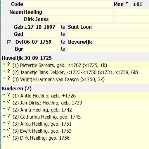 Gegeven: Anna Heeling (*1742 †1830) is een dochter van Dirk Jansz Heeling (*1697 †1759) en Jannetje Jans Dekker (* vóór 1723 † vóór 1750).