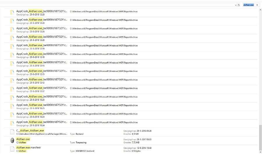 Ik heb gezocht in mijn PC op aldfaer.exe en krijg dan een lijst met AppCrash_Aldfaer.exe.