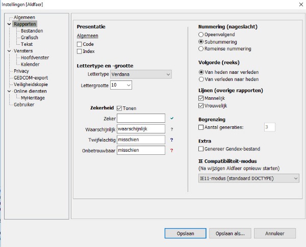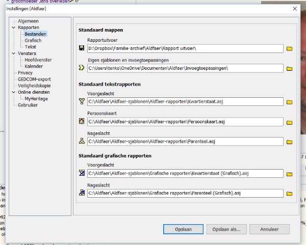 Heb zojuist een mapje aangemaakt op de D schijf, niet in Dropbox en op de C schijf en beiden geprobeerd, maar het verschijnsel blijft zicht voordoen. Merk dat het nu vooral de kwartierstaat is die niet op het scherm verschijnt. De parenteel wel, maar tot vier generaties. Als ik verder ga dan wordt die niet meer gepakt. De omvang van gegevens blijkt een rol te spelen. Maar dat had ik met de vorige versie nooit. Ik werk al heel lang met Aldfaer, ook op deze laptop.