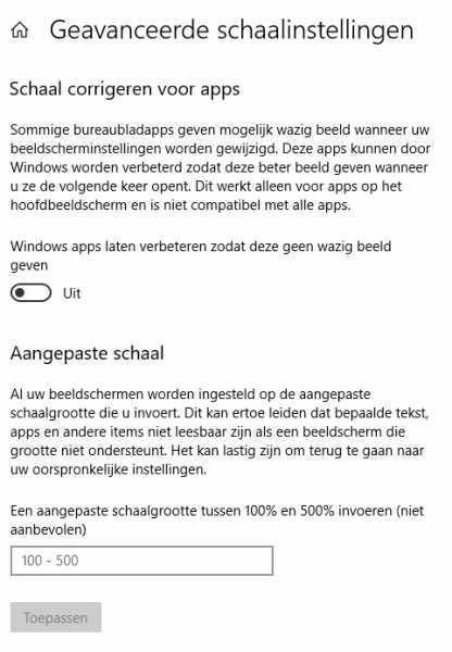 Ik kwam ook net onder de link bij Beeldscherm > Schaal en lay-out >Geavanceerde scherminstellingen, onder Aangepaste schaal bijgaande tekst tegen. Schermprintje in nieuw bericht