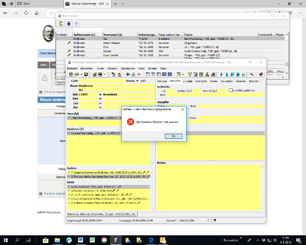 Als ik bij een persoon bijv. de geboortedatum wil invullen krijg ik een foutmelding die bestaat uit een rood kruis in een cirkel met daar aan de tekst "kan bestand Geboorte niet openen." Dit komt ook bij andere wijzigingen voor zoals overlijden enz. De wijzigingen worden ook niet opgeslagen. Probleem is ontstaan na de laatste update, naar 7.0