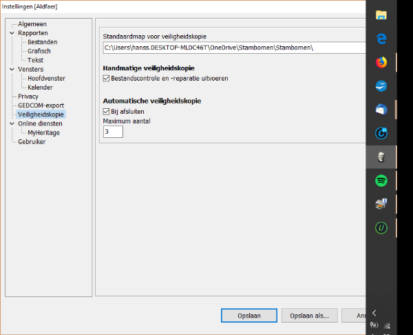 Maar wat mij meer zorgen maakt is dat het er op lijkt, gezien het pad van de v-kopie, dat je stamboombestand(en) in ...\OneDrive\Stambomen\ staan. Als dat inderdaad het geval is, verklaart dit waarom het bestand beschadigd is. De Aldfaer stamboombestanden mogen niet in OneDrive, iCloud en dergelijke geplaatst worden.