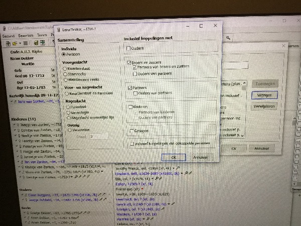 En nog een afbeelding bovenste persoon Lena Dekker is de laatste die ik toegevoegd heb met de voorwaarden persoon met partner en broers en zussen met hun partners. Ik kan het in principe snel oplossen door de voorwaarden bij Lena te veranderen en de broers en zussen apart in te voeren. Maar omdat dit probleem in 6.2 niet speelde wilde ik het toch even melden.