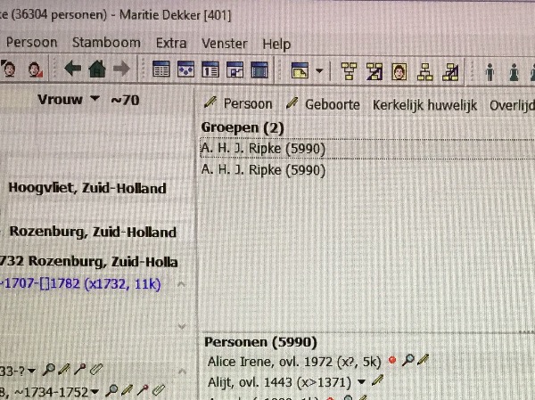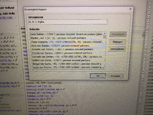Beste Ruud, ik heb deze groep maar een keer aangemaakt. De persoon waar nu twee keer die groep staat heb ik met haar partner in die groep geplaatst met toevoegen bestaande groep persoon gekozen en partner aangevinkt meer niet. Nu heb ik een stuk of 5 broers en zussen gevonden die ik indeze groep wilde hebben. Dus een zus genomen en gekozen voor toevoegen bestaande groep de juiste groep genomen persoon genomen, en broers en zussen met hun partners aangevinkt. Dus dat gaat helemaal goed behalve bij de zus en haar partner die al in die groep stonden, beiden hebben nu 2 maal de groep A. H. J. Ripke staan in hun persoonsblad, maar gelukkig komen ze beiden maar een keer in de groep voor. Ik doe het al jaren op deze manier en nu dus vandaag voor de eerste keer in versie 7. In versie 6.2 nooit meegemaakt. Ik neem dus aan dat er ergens in Aldfaer bij het toevoegen niet gekeken wordt of de persoon al lid is van de groep en de vermelding dus niet genoteerd moet worden onder groepen. A. H. J. Is mijn hoofdgroep en mijn kwartierstaat. Vanwege het feit dat er vele takken bestaan van personen met dezelfde achternaam als die ik onderzoek heeft ieder tak een andere code. En ivoer ik personen selectief toe aan de diverse takken. Juist omdat het nu om broers en zussen gaat die verder in geen enkele ander groep voor zullen komen, heb ik de personen op de beschreven manier toegevoegd.