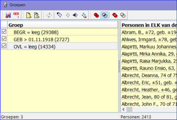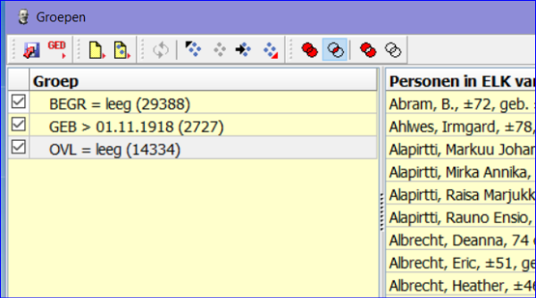 05 nov 2018 23:30 - 05 nov 2018 23:31Hoewel ik het volledig eens was dat de beste en snelste methode terug naar een veiligheidskopie te gaan is, heb ik voor de sport mijn aangegeven methode getest op een normale stamboom van ca. 18000 personen, waarvan 5900 reeds als overleden gemerkt en 11000 ouder dan 100 jaar zijn. Hieruit blijkt dat het aantal te corrigeren personen toch nog aanzienlijk blijft.JayCee schreef : ....kan dit misschien helpen:....