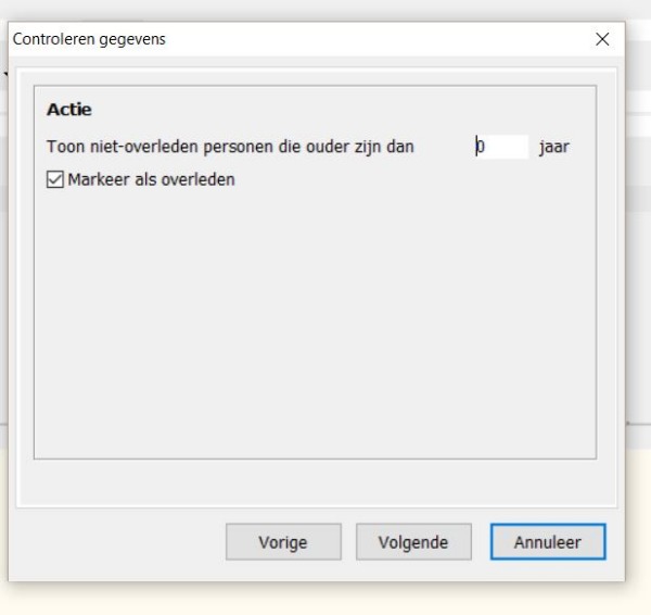 Bij een controle van mijn aldfaerstamboom stond bij "actie" "niet overleden personen die ouder zijn dan x jaar" markeren als overleden" verkeerdlijk op 0 i.p.v. van op 100 .