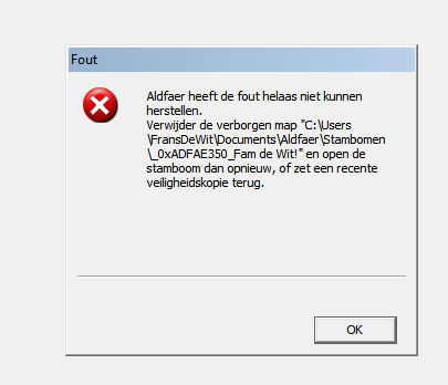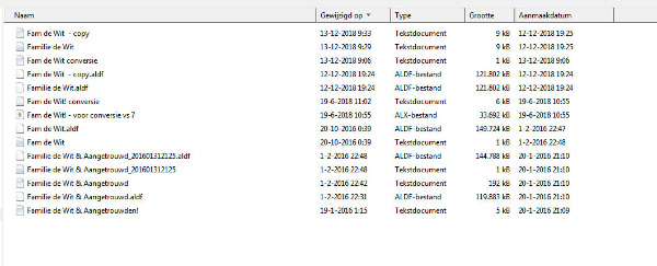 Dat bestand staat er helemaal niet meer in, wat genoemd werd. Ik heb een veiligheid copy willen openen dat lukt ook niet op het moment dat ik een nieuwe naam aangegeven heb, zie ik hem ook in genemde map staan en als ik dan op ok in aldfaer klikt, dat ik de melding gelezen heb. verdwijnt die ook weer in die map. In het overzicht zie je van 12-12-2018 mijn originele stamboom staan en de anderen van later zijn mijn pogingen. Wat nu?