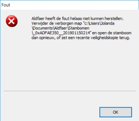Heeft u al getracht de recenste veiligheidskopie in te lezen? Zo niet, ga hiervoor naar menu Bestand > Zoek Aldfaer-bestanden, selecteer de recenste veiligheidskopie en klik op 'Open stamboom' en vervolgens bewaren met de juiste stamboomnaam.