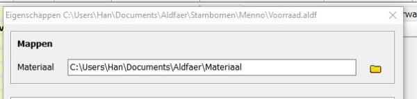 De bedoeling van de mapnaam bij de Eigenschappen is om daar de mapnaam te kiezen waar u weet dat al uw foto's staan. U kunt ook buiten Aldfaer om met de Windows verkenner uitdokteren waar alle foto's staan en als die gevonden is moet u die mapnaam invullen bij Stamboom -> Eigenschappen.