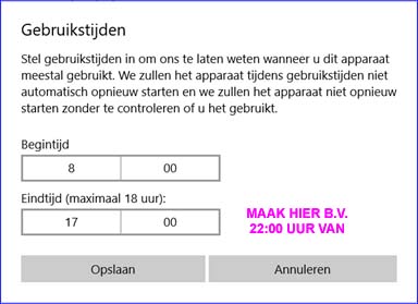2. Uw instelling van de gebruikstijden te wijzigen opdat de kans van geforceerd afsluiten van Aldfaer door de automatische update geminimaliseerd wordt.
