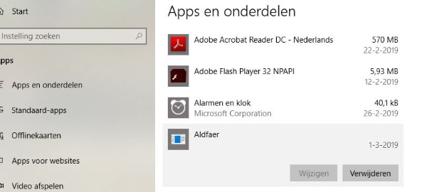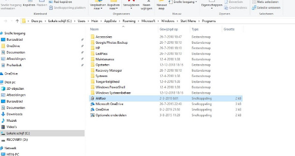 Klik ik (rechtermuisknop) bij de "programma's", op Aldfaer> meer > bestandslocatie openen, dan kom ik bij wat U op bijgevoegde bijlage 6 ziet.