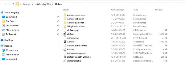Op C:\Aldfaer ziet u Aldfaer met in het kolommetje daarnaast TOEPASSING. Dat u niet de Aldfaer.exe ziet is omdar u in de Windows instelling de bekende extensies verborgen heeft. Dus dubbelklik eens op dat bestand.