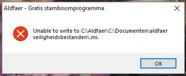 Ünable to write to C:\Aldfaer\:C\Documenten\aldfaer veiligheidsbestanden.ini