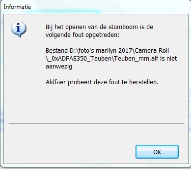 Ik heb net de update gedaan van aldfaer naar 7.1. Nu probeer ik mijn stamboom te openen en krijg ik de volgende melding. Wat kan ik doen om mijn stamboom terug te krijgen?