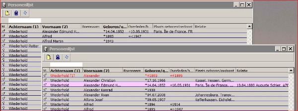 Onderstaand een voorbeeld van personenlijsten, maar de opmerking slaat op alle geopende hulpvensters, inclusief koppelvenster.