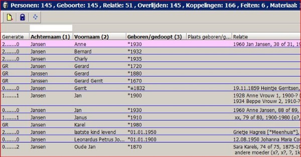 Als voorbeeld een personenlijst uit een testbestandje waar Jansen en Janssen zijn "samengevoegd"