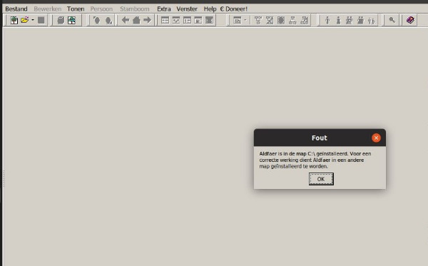 Als ik echter Aldfaer wil opstarten krijg ik een melding dat het programma in een bepaalde map is geïnstalleerd, maar in een andere map zou moeten staan om te starten, maar er staat niet bij welke.
