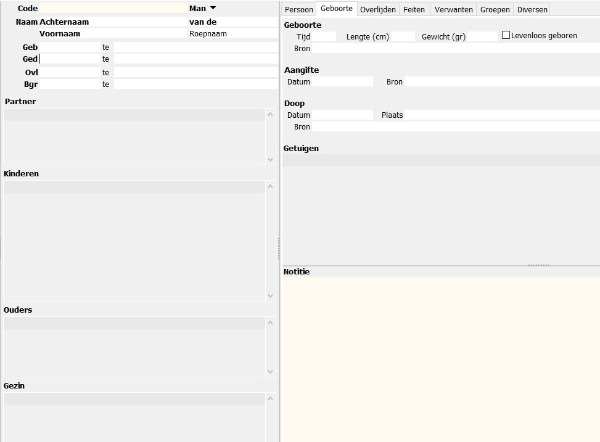 Het is misschien een beetje verwarrend: Op het tabblad Geboorte kun je een doopdatum en -plaats invullen welk ook links komt te staan. Voor de geboortedatum en -plaats geldt dit niet: Die kun je alleen op het linker deel invullen.