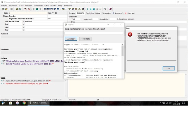 Volgens de foutmelding heb je de OneDrive toegewezen voor de rapportuitvoer. Ik ben niet zeker of dat is toegestaan. Misschien dat Han Kortekaas dienaangaande een duidelijke instructie kan opstellen van wat nu wel of niet met Aldfaer <> OneDrive is toegestaan