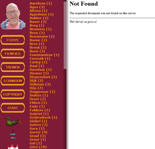 Verergerd: helaas geeft vervolgens het aanklikken van een accentnaam helemaal geen persoonskaart weer. Er verschijnt een wit scherm met de tekst: NOT FOUND - The requested document was not found on this server. (afbeelding 2)