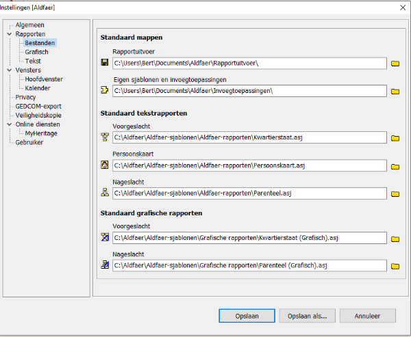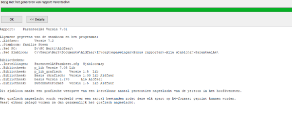 Onlangs nieuwe laptop aangeschaft en hierop laatste versie Aldfaer geïnstalleerd. Bestanden overgeheveld op nieuwe laptop. Bonus rapporten probleemloos geïnstalleerd. Probleem is nu rapporten genereren. Deze lopen vast, groene balk vult zich wel maar er gebeurd verder niets. Aantal personen is uiterst beperkt en slechts 3 generaties. Merkwaardige is dat na installatie van bonus rapporten ik wel een rapport kon draaien. Na aanpassing van familiebestand loopt het echter nu vast. Wat gaat er / doe ik fout?