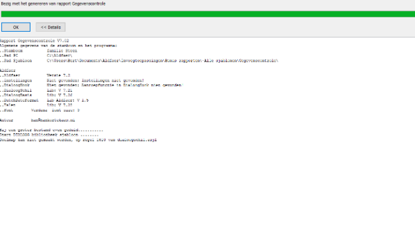 Houd de toets Ctrl in bij starten van het rapport. Het verloop van het rapport is zichtbaar in het detailvenster. Maak hiervan een knipsel wanneer het verloop is gestopt en stuur het op in bijlage.