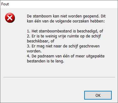 Het antwoord op 'padnaam te lang' kunt u vinden door naar de map te kijken C:\users\uw inlognaam\Documenten\Aldfaer\Stambomen\ en dan kijken of de naam van het bestand niet te lang is met te veel cijfers. Ik vermoed van niet want Ruud heeft u onlangs geholpen.