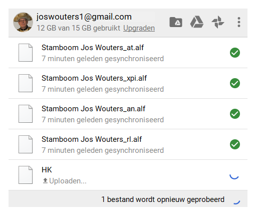"_0xADFAE350_Stamboom Jos Wouters". Hierin komt een bestand genaamd HK zonder extentie en met 0 records dat niet kan upgeload worden naar Google drive en geeft na geruime tijd proberen een upload foutmelding.