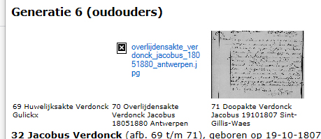 Bij menu => Rapporten => kwartierstaat kan je een rapport afdrukken met afbeedlingen, maar sommige afbeeldingen worden weergegeven en sommige niet. Dan krijg je een zwart vierkantje met een wit kruis erin te zien. Maar de naam van de foto of akte staat er wel bij.