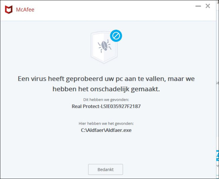 Zo ook bij mij! McAfee is blij dat ie een virus heeft verwijderd in Aldfaer.exe van versie 8.1 Resultaat nu geen Aldfaer meer. Volgens McAfee gaat het om LS!E035927F2187