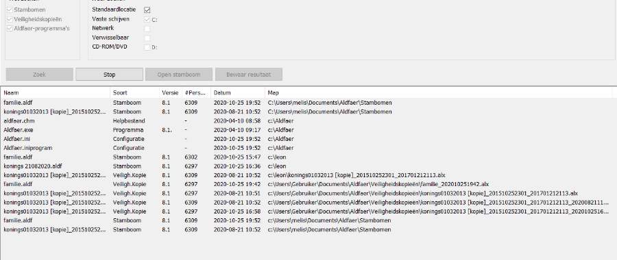 Ga naar menu Bestand > Zoek Aldfaer-bestanden en vink alles aan in de linker kolom, en in de rechter kolom de vaste en verwisselbare schijven(indien aangesloten). Maak een (leesbare)schermafdruk(knipsel) van het resultaatvenster en stuur ze in bijlage.
