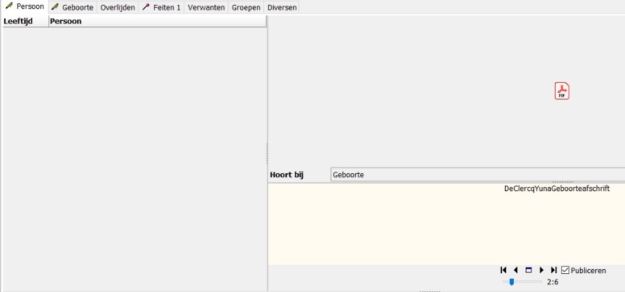 Bij het koppelen van een pdf wordt enkel het icoontje getoond in het rechtervak naast "persoon". Wanneer men dan het vak "hoort bij" invult wordt normaal gezien op het betrokken tabblad (bv geboorte) het bestand getoond. Bij een PDF gebeurt dit echter niet. Kan dit aangepast worden?