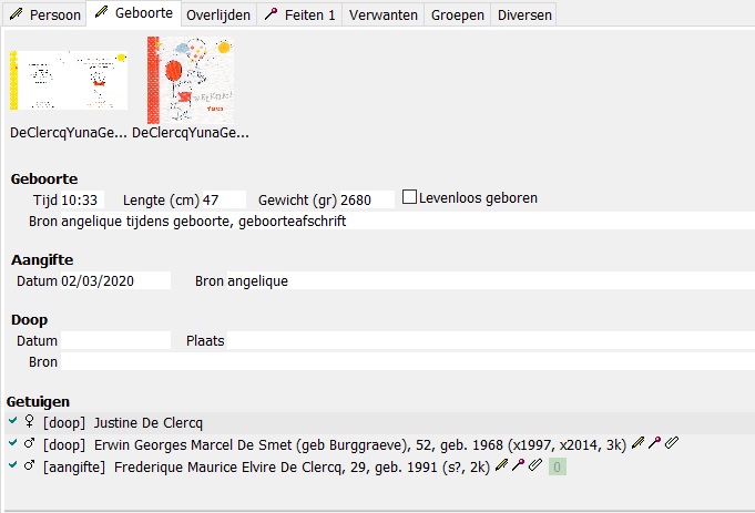 Mogelijk ter verduidelijking van Etienne's vraag zoals ik die lees: op het tabblad Persoon laten de aangehechte beeld extensies een plaatje zien en de tekst extensies (pdf, doc, txt) het bijbehorende icoontje. Als je met "Hoort bij" het bestand toewijst aan bv geboorte, huwelijk of overlijden, dan wordt op het betreffende tabblad bij de beeld extensies daar ook het plaatje getoond, maar bij de tekst extensies niet het bijbehorende icoontje. Ik begrijp, dat Etienne daar ook graag het icoontje ziet, net als op de tab Persoon. Of het echt zinvol is, daar kan men van mening over verschillen.