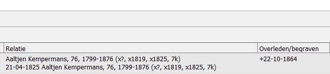 om te kunnen zeggen dat er maar 1 Aaltje is moet u de Personenlijst minstens op twee elementen sorteren (1) Achternaam (2) Voornaam . Zelf heb ik dan ook nog (3) geboortedatum bij.