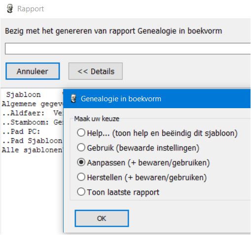 Bij menu Tonen > Rapporten > Overige rapporten ( in linker kolom) > Bonus raporten > Exporteren > Maak Boeken kan je kiezen welk boek je maken wil. In de help van het rapport kan je de instellingen overlopen en de weergave van de foto's naar keuze instellen. In Extra > instellingen voor tekstrapporten > Presentatie moet dan wel een vink staan bij Materiaal.