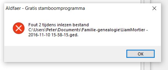 Ik werk tot op heden met My Heritage. Op zich een slecht programma maar toch met een aantal onhebbelijkheden, vooral in het beheer en weergeven van foto's en het krakkemikkige taalgebruik in rapporten. Daarom wou ik Aldfaer proberen. Een serieus probleem echter: als ik in My Heritage een gedcom-bestand aanmaak en dit in Aldfaer wil importeren krijg ik volgende foutmelding: