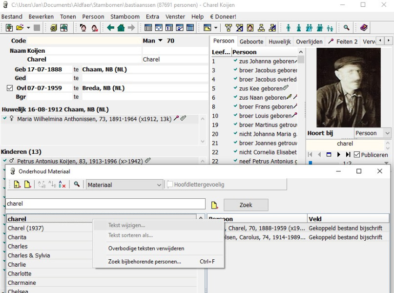 Maar... Het is niet onmogelijk dat één en hetzelfde bijschrift meerdere malen gebruikt is. Als dat het geval is, kan men dan niet met die dubbelklik automatisch de zoekfunctie activeren? De gebruiker ziet dan dat het meerdere malen voorkomt en dient de gewenste persoon aan te klikken om het bijschrift te kunnen wijzigen volgens procedure a t/m e