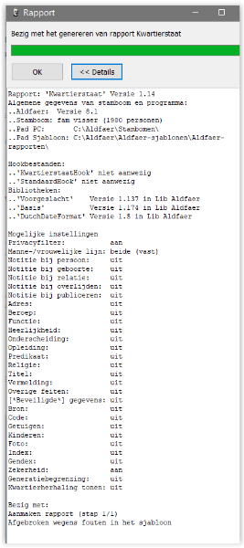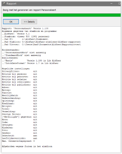 In aanvulling; de fout 'afgebroken wegens fout in sjabloon' kan ontstaan als er een onbereikbaar pad is ingevuld onder Extra -> Instellingen -> bestanden _ Rapportuitvoer. Wilt u toch eens controleren als u met de Windows verkenner naar C:\Users\Daaf\Documents\Aldfaer\Rapportuitvoer gaat of dat pad echt bestaat. Of moet er misschien C:\Users\Daaf\Documenten\Aldfaer\Rapportuitvoer\ staan? Of is uw 'Daaf' wel de correcte login naam?