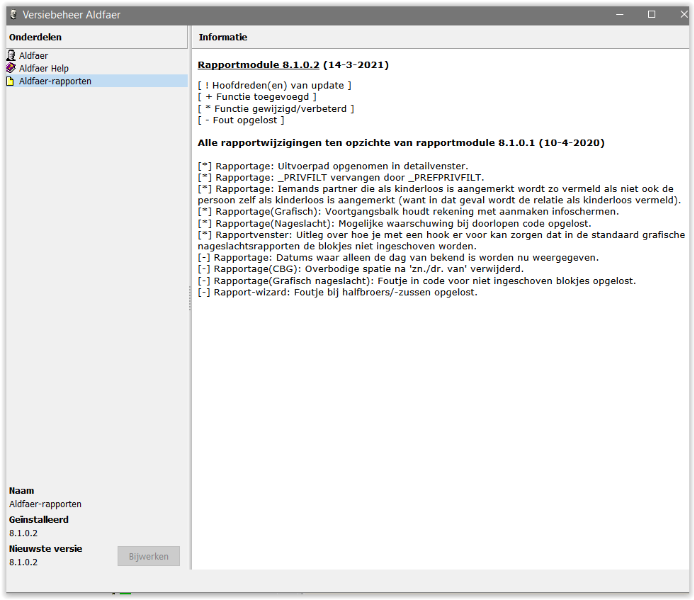 Controleer de versie van de rapportent door in Help > Versiebeheer Aldfaer de geïnstalleerde versie met de nieuwste versie te vergelijken. Indien niet is uitgevoerd klik op 'Bijwerken'. Dezelfde controle kunt u uitvoeren voor de invoegtoepassingen.