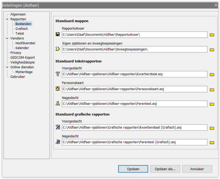 Folders \stambomen, \gedcom en \materiaal staan onder C:\Aldfaer\