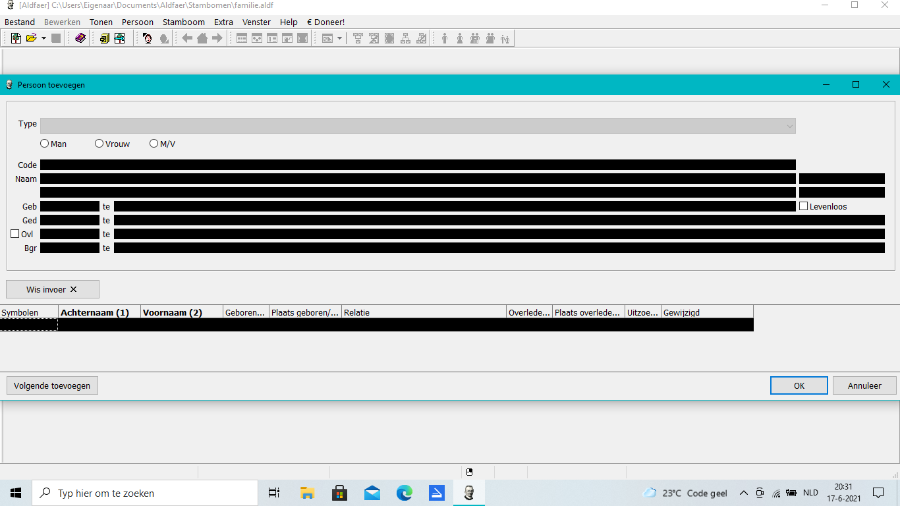Han Kortekaas, de opmerking van de bestandjes en de maamswijziging werd al eens als oplossing gegeven. Wanneer ik nu de meest recente stamboom selecteer en open om gegevens in te voeren dan krijg ik een grijs scherm maar als ik de naam vervolgens wil invoeren dan is het invulscherm helemaal zwart.