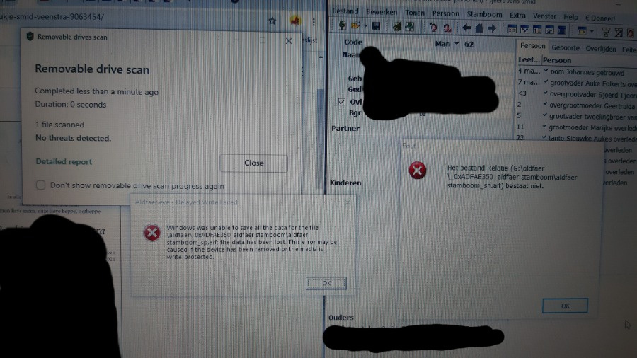 Ik heb mijn bestanden op en externe harde schijf. Als ik het Aldfaer programma geopend en krijg ik de meldingen in beeld zoals op de bijlage is te zien en kan ik niet meer voor nog achter uit . Nu is mijn bestand helemaal in de war. Ik heb nu alleen nog lossen personen in mijn bestand zonder koppelingen. Niets zit nog aal elkaar. Help, wat is er misgegaan. Komt dit door de update, heb ik iets fout gedaan? En kan het weer goed?? Wie kan mij helpen? Vriendelijke groet Froukje