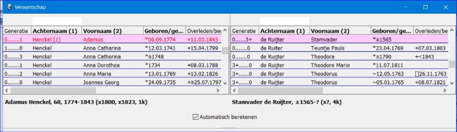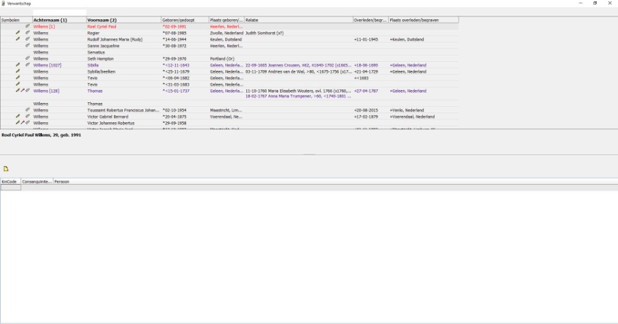 Ik heb gezocht in het forum en de helpfile naar het aantonen van verwantschap tussen 2 personen. Ik krijg dit niet goed voor elkaar. Als ik op het icoontje voor verwantschap klik en ik pak de hoofdpersoon uit de stamboom (in dit geval mijn zoon) en ik klik dan op een andere persoon dan veranderd aldfaer in het zoeken op deze nieuwe persoon. Als ik echter door de lijst heen scroll dan zijn er personen waarbij ik de verwantschap in het dossiervenster zie en bij andere personen verschijnt er niets, ook als er duidelijk een directe verwantschapslijn te zien is (personen staan in blauw aangegeven met een nummer erachter).