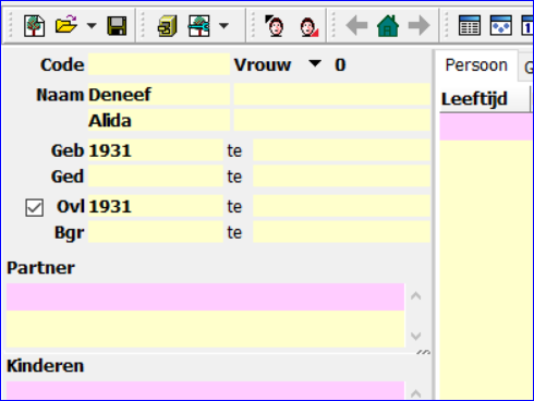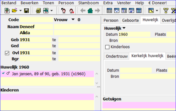 2. Koppel Vrouw aan Man met relatievorm Huwelijk en vul op het tabblad Huwelijk bij Kerkelijk Huwelijk een datum in, b.v. 1-1-2000. De tekst van het tabblad is nu Kerkelijk huwelijk en bovenaan het partnerblok staat nu Kerkelijk huwelijk 1-1-2000