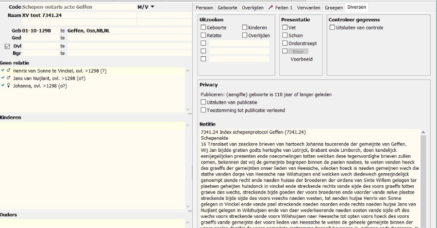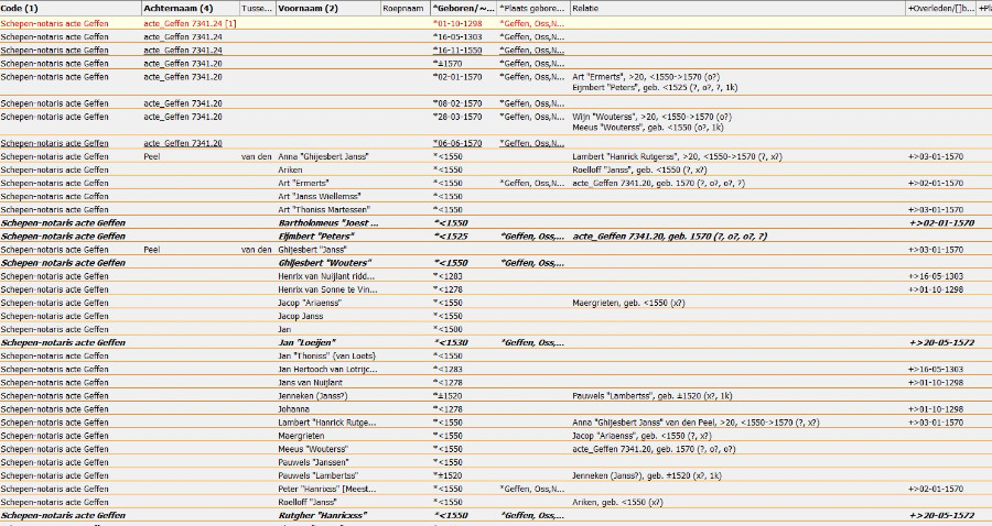 Wil met een plaats Geffen waar alle actes tussen 1200 en 1650 geindexeerd getranscribeerd zijn. Dit zijn slechts 878 schepen en notaris actes. Wil deze in een bestand gaan zetten en de personen koppelen die in die acte voorkomen.