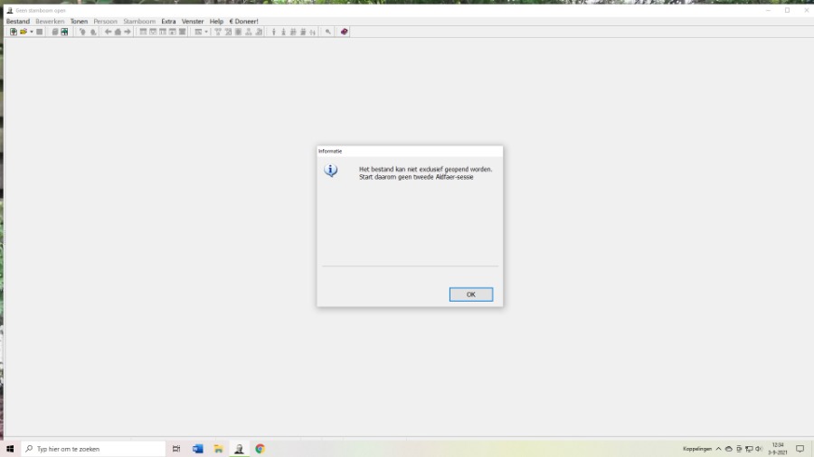 Bij opnieuw starten krijg ik dan de informatie dat het bestand niet exclusief kan worden geopend.