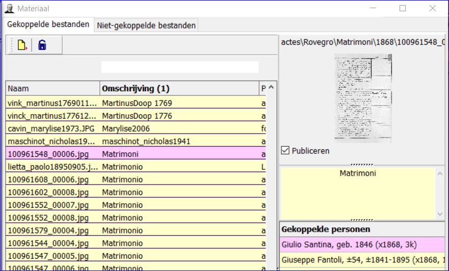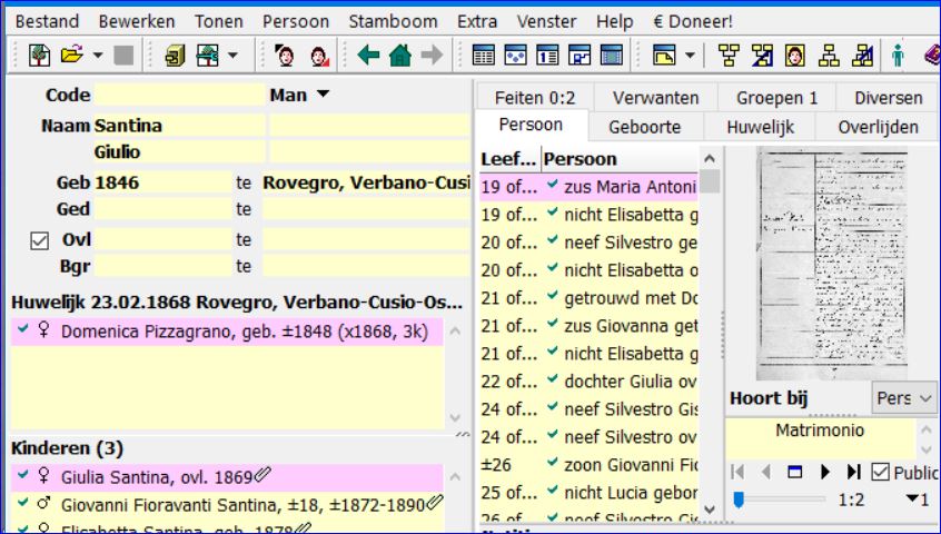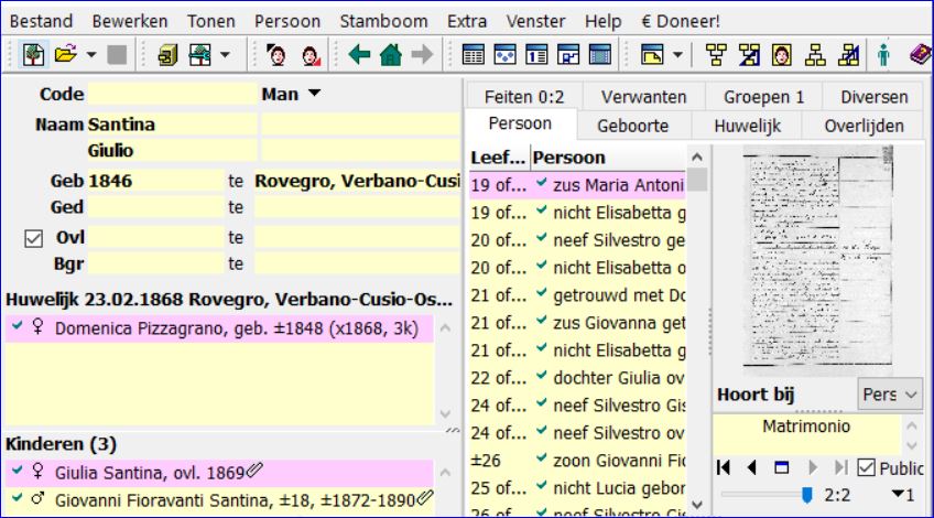 2. Een bijschrift bij de koppeling van de foto aan Giulia Santina. Dat zie je staan in het hoofdvenster als je Giulia Santina tot hoofdpersoon maakt.